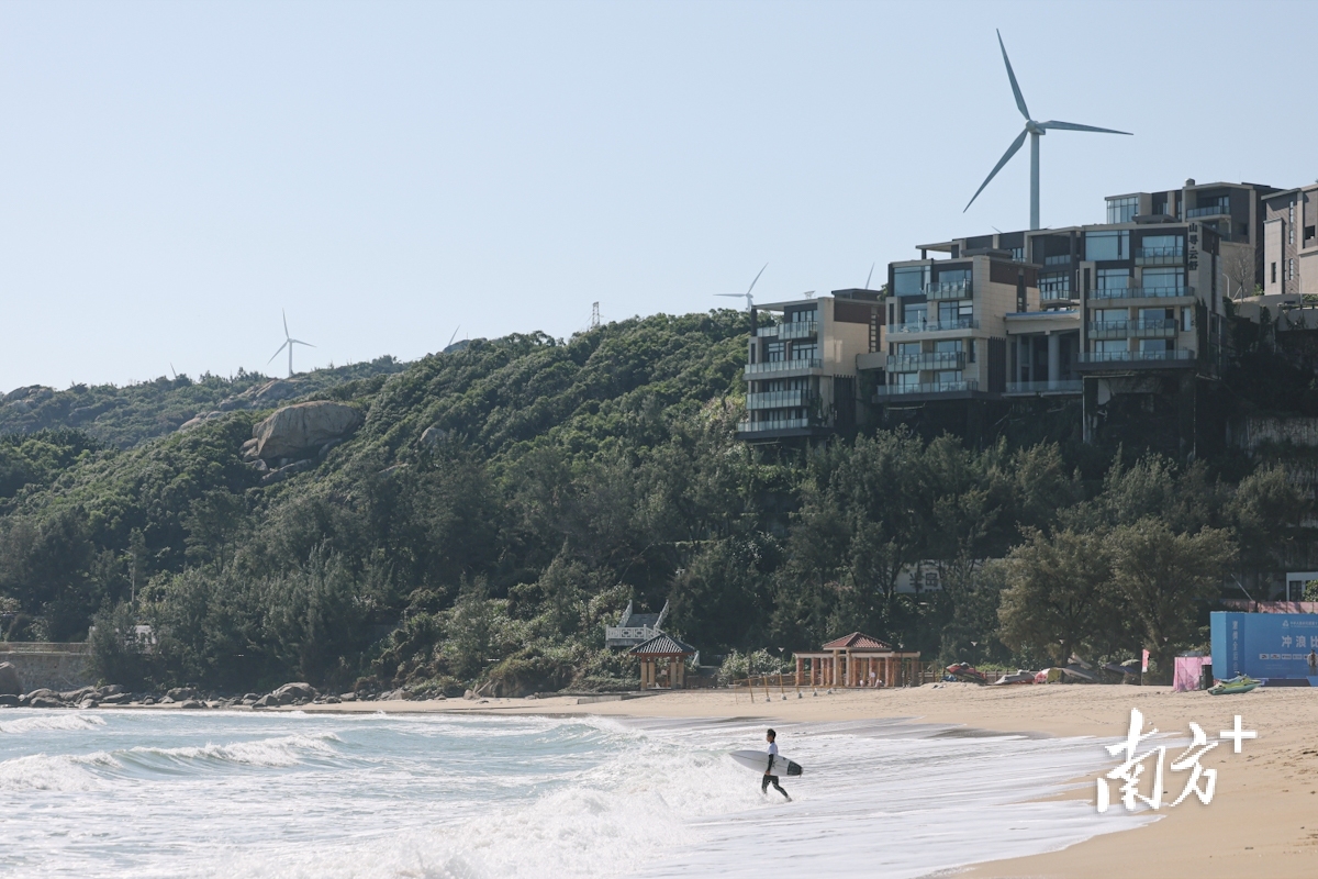十五运会冲浪比赛,队员从入海点入海,远处风力发电机矗立在山上。 南澳岛能够承办全运会冲浪赛事,源于其得天独厚的自然条件。这里拥有近92公里超长海岸线与66处海湾,其中青澳湾被誉为“冲浪胜地”,全年可冲浪天数超过300天,冬季浪况稳定、绵长且有力,为冲浪比赛提供了绝佳条件。
