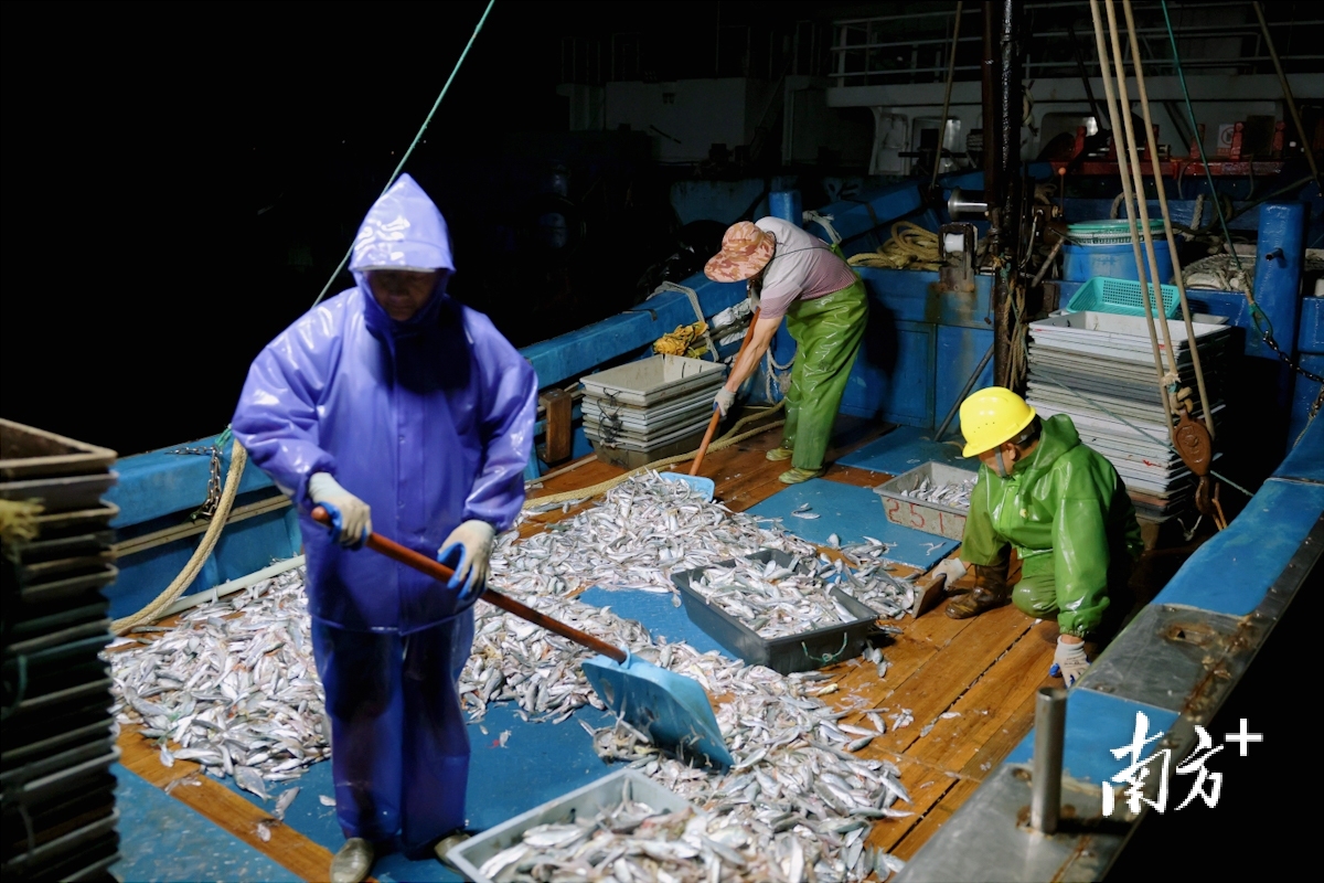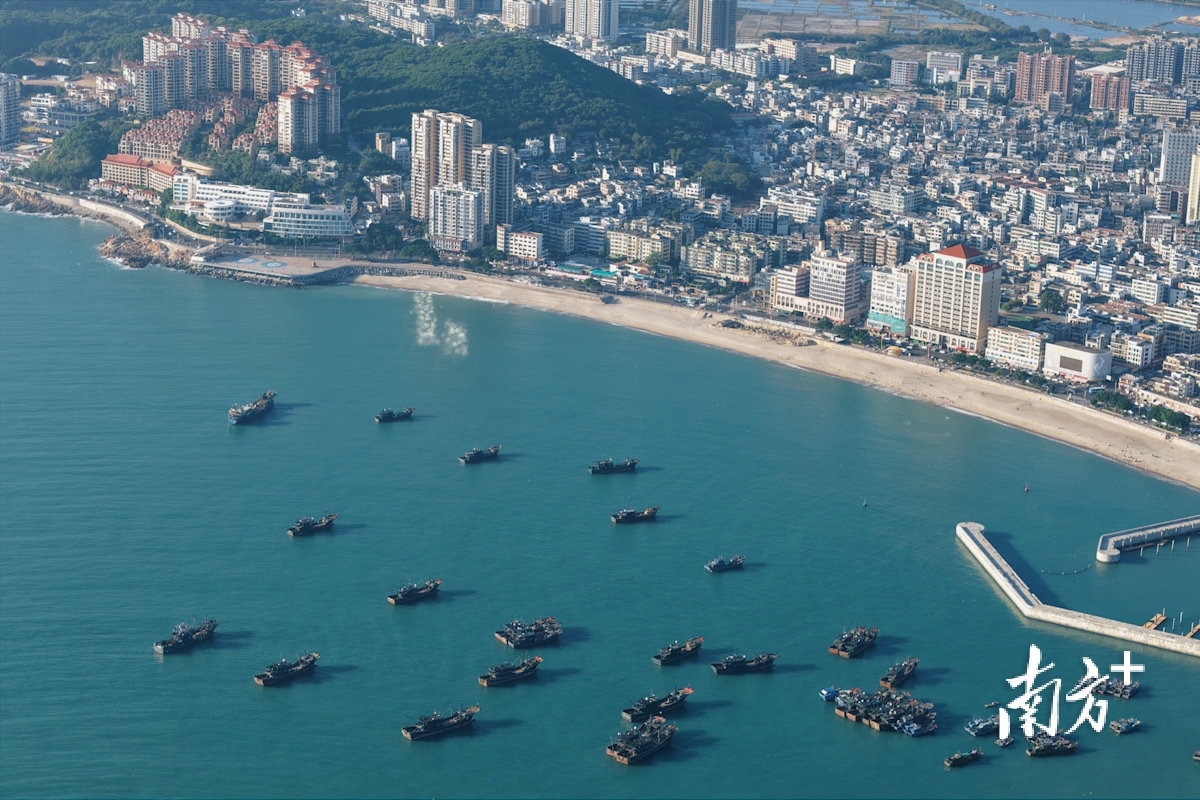 鱼贩在挑选新鲜渔获。 海面上,参赛选手在碧海蓝天间劈波斩浪。与此同时,渔民的劳作依旧如常。一艘艘渔船驶离码头,前往捕捞海域;又有一艘艘渔船满载而归,渔港码头热闹非凡。