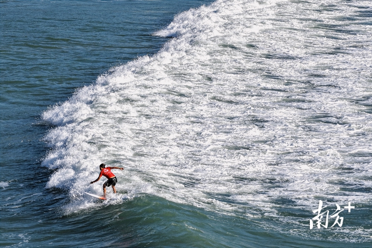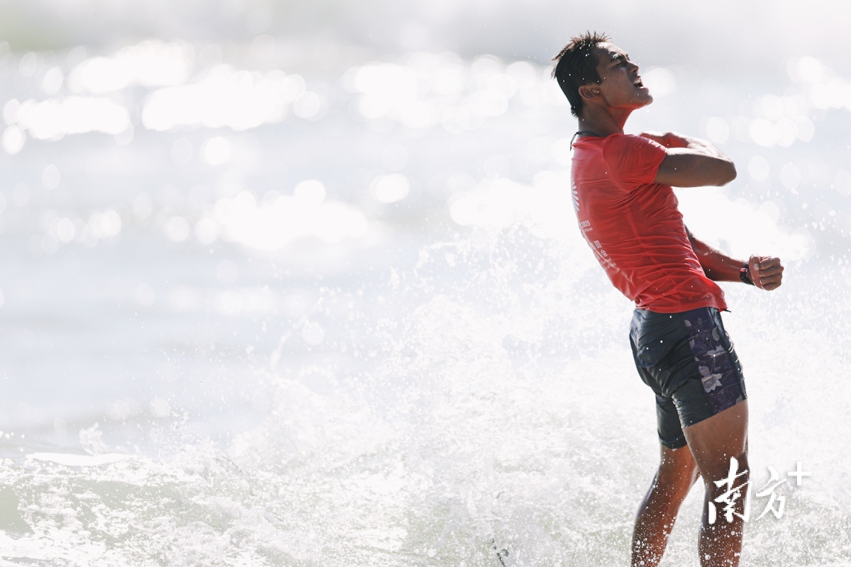 男子短板冲浪决赛,海南队吴世栋获得致胜分后庆祝,他最终夺冠。 阳光为浪花镀上金辉,全运会冲浪板在海面划出优美弧线;年轻游客端着咖啡面海听风,远处丰收的渔船正缓缓归航。这个周末,体育竞技的激情与海岛日常的闲适,在粤东这座小岛上和谐相融——这就是南澳岛的全运周末。