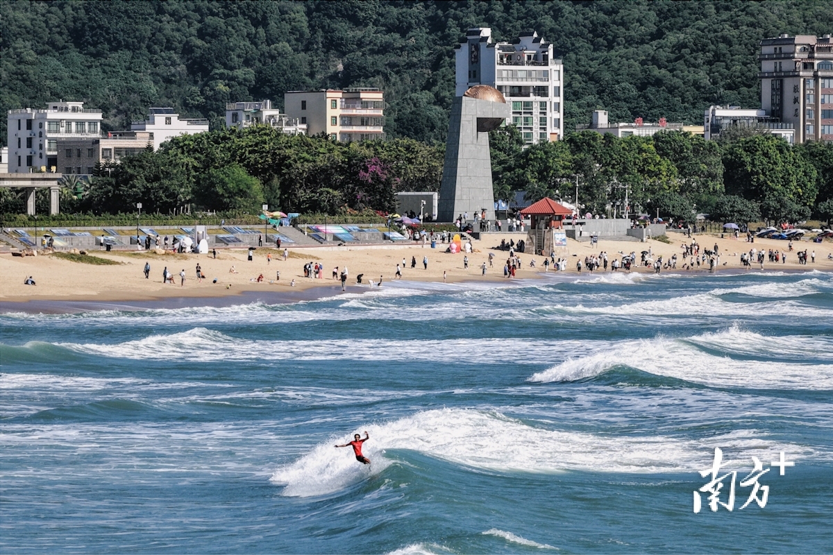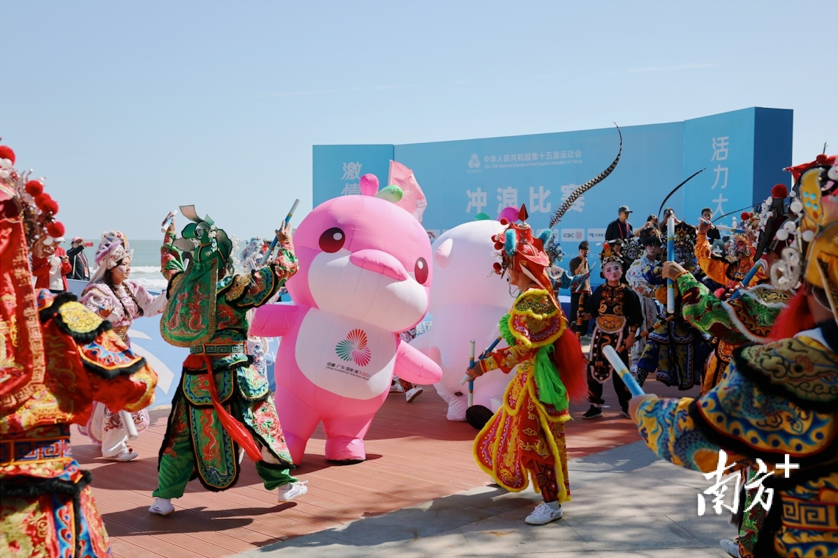 冲浪项目颁奖仪式在海边进行,全运会吉祥物与英歌队共舞。 11月16日,第十五届全国运动会冲浪项目决赛在这片美丽海域举行,海南选手吴世栋和四川选手杨思琪分别夺得男子、女子短板金牌。选手们等浪、看浪、划水、抓浪、起乘站立、顶转、回切等系列动作一气呵成。海风掠过浪尖,碧波间划出优美弧线。运动员们劈波斩浪的英姿,也成为一道独特的风景线,吸引众多游客驻足观赏。